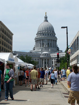 Then we headed to the downtown art festival, right outside the lovely capitol building that dominates the city of Madison. The kids had fun in the children's area, playing in the bouncy house, making silk screen prints of a green duck, making potato prints. Sophie got her arms painted with a green snake and a purple butterfly.