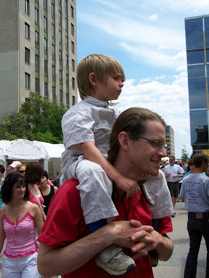 We went back to the Fete today, along with Bill and Michelle and kids. While we were there a couple of Cajun music groups performed (enjoyable) and we sampled more of the Wisconsin beer along with Jamaican jerk chicken and rice, raspberry sorbet, and caramel truffles. The truffles came with crystals of salt on top--a novel experience.