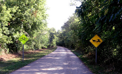 Then we loaded our bikes into the truck and drove to the town of Millersburg to a point where we could pick up the the Holmes County Trail. We biked a few miles north from Millersburg and back. This multi-purpose trail covers several miles. One 8-foot lane of is paved with asphalt for biking. The other lane is paved with something called "chip and seal" for horse-drawn vehicles and horseback riding. The different lanes are identified by signs posted every so often along the way.